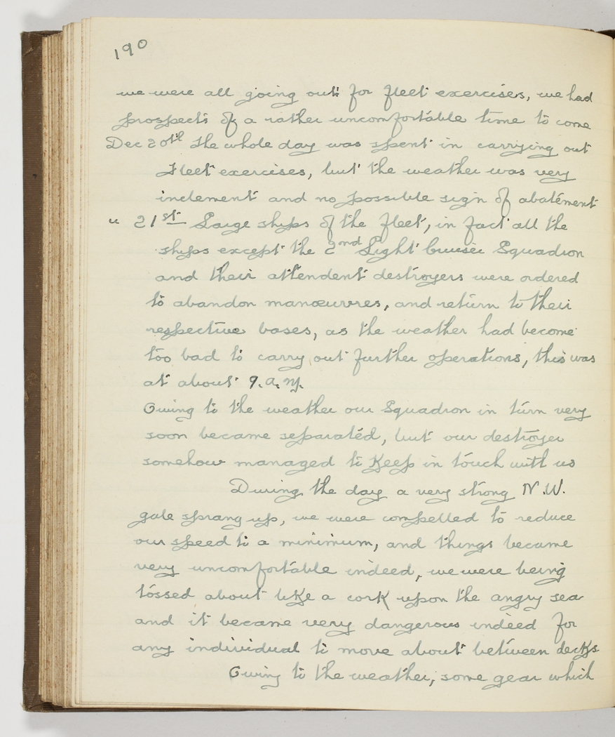 Dec 21st Large ships of the fleet, in fact all ships except the 2nd Light Cruiser Squadron and their attendant destroyers were ordered to abandon manoeuvres, and return to their respective bases, as the weather had become too bad to carry out further operations, - this was about 9 a.m. Owing to the weather our Squadron in turn very soon became separated, but our destroyer somehow managed to keep in touch with us