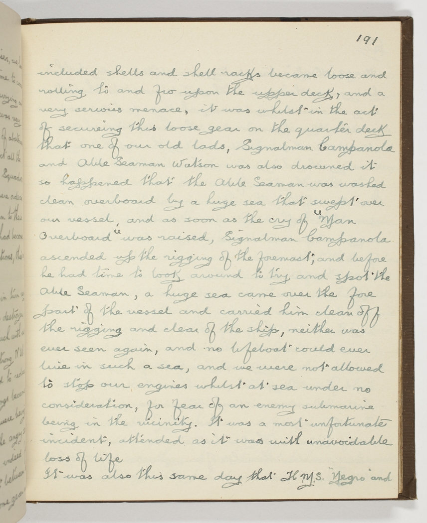 it so happened that the Able Seaman was washed clean overboard by a huge sea that swept over our vessel, and as soon as the cry of "Man Overboard" was raised, Signalman Campanola ascended up the rigging of the foremast, and before he had time to look around to try and spot the Able Seaman, a huge sea came over the fore part of the vessel and carried him clean off the rigging and clear of the ship – neither was ever seen again, and no lifeboat could ever live in such a sea, and we were not allowed to stop our engines whilst at sea under no consideration, for fear of an enemy submarine being in the vicinity.