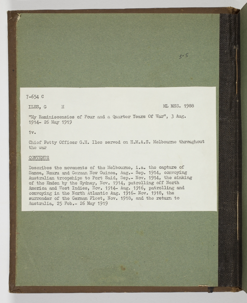 Describes the movements of the Melbourne, i.a. the capture of Samoa, Nauru and German New Guinea, Aug.- Sep. 1914, convoying Australian troopships to Port Said, Sep.- Nov. 1914, the sinking of the Emden by the Sydney, Nov. 1914, patrolling off North America and West Indies, Nov. 1914- Aug. 1916, patrolling and convoying in the North Atlantic Aug. 1916- Nov. 1918, the surrender of the German Fleet, Nov. 1918, and the return to Australia, 25 Feb.- 26 May 1919.