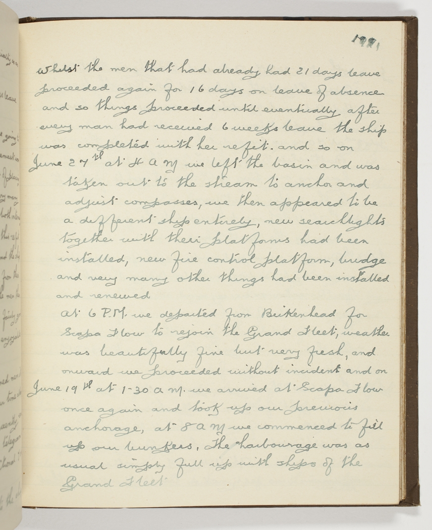June 27th at 4 am we left the basin and was taken out to the stream to anchor and adjust compasses, - we then appeared to be a different ship entirely, - new searchlights together with their platform had been installed, new fire control platform, bridge and very many other things had been installed and renewed – At 6 P.M. we departed from Birkenhead for Scapa Flow to rejoin the Grand Fleet, - weather was beautifully fine but very fresh, and onward we proceeded without incident and on