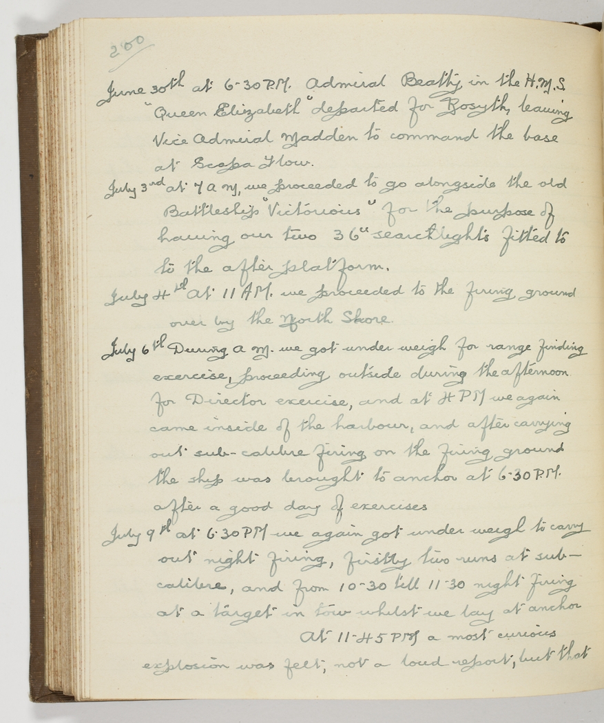 July 9th at 6.30 PM we again got under weigh to carry out night firing, firstly two runs at sub-calibre, and from 10.30 till 11.30 night firing at a target in tow whilst we lay at anchor – At 11.45 PM a most curious explosion was felt, not a loud report, but that