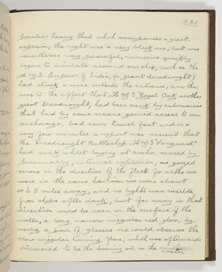 bad news travel fast and in a few minutes a report was received that the Dreadnought Battleship HMS "Vanguard" had sunk whilst laying at anchor caused by presumably, internal explosion, - we gazed across in the direction of the fleet for altho we were in the same harbour we were about 4 to 5 miles away, and no lights were visible from ships after dark, - but far away in that direction could be seen on the surface of the water, a long narrow irregular red glow, - by using a pair of glasses one could observe the slow irregular burning flare, which was afterwards discovered to be the burning oil on then water