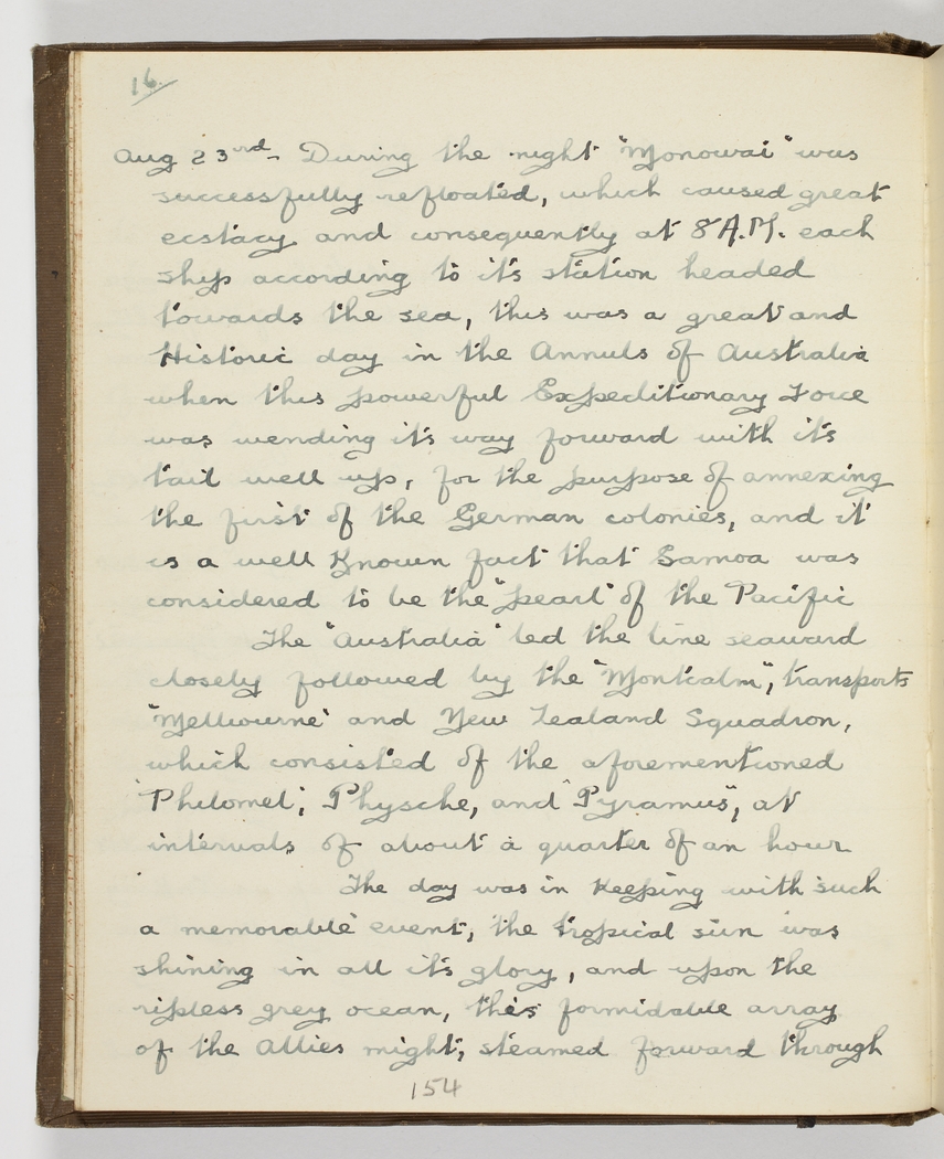 Aug 23rd During the night "Monowai" was successfully refloated, which caused great ecstacy and consequently at 8 A.M. each ship according to its station headed towards the sea, - this was a great and Historic day in the Annuls of Australia when this powerful Expeditionary Force was wending its way forward with its tail well up, for the purpose of annexing the first of the German colonies, and it is a well known fact that Samoa was considered to be the "pearl" of the Pacific.