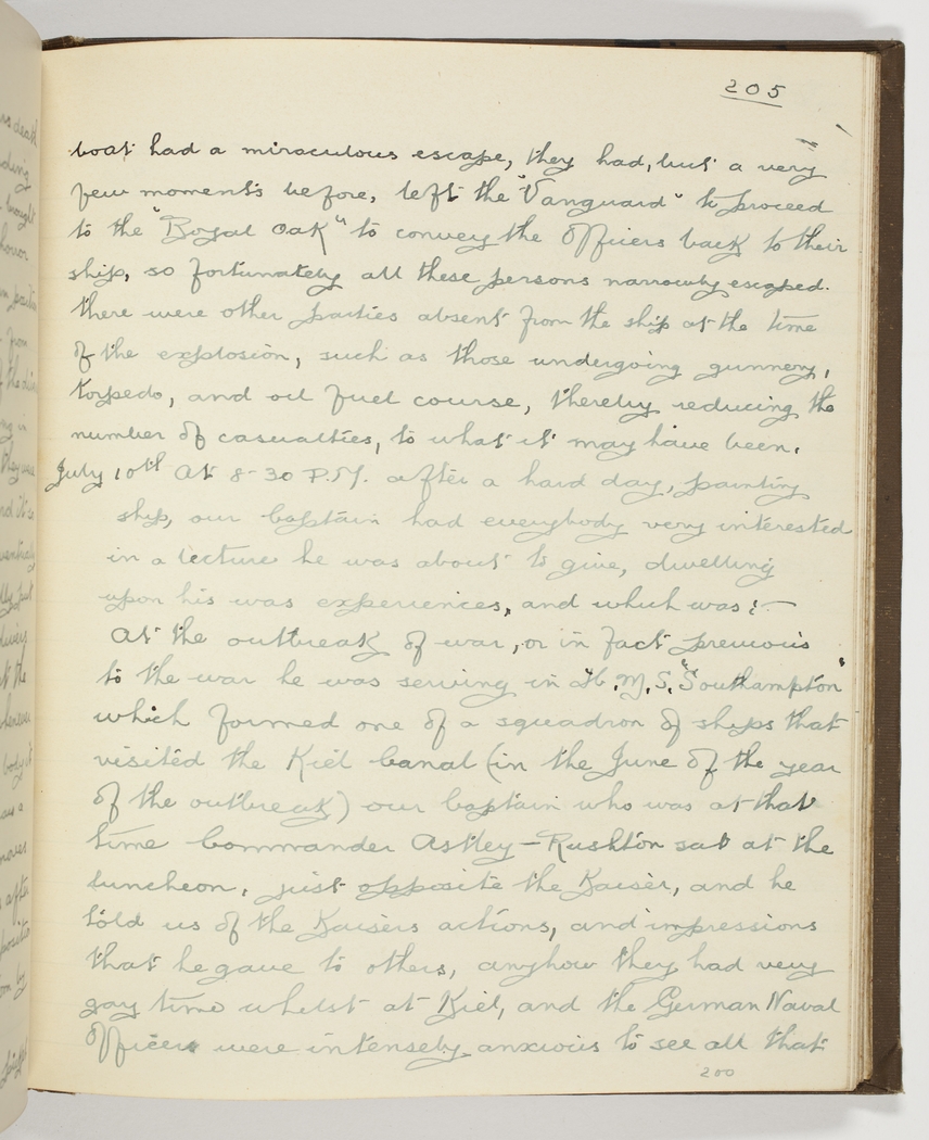 July 10th [1917] At 8.30 P.M. after a hard day, painting ship, our Captain had everybody very interested in a lecture he was about to give, dwelling upon his war experiences, and which was; - At the outbreak of war, or in fact previous to the war he was serving in H.M.S. "Southampton" which formed one of a squadron of ships that visited the Kiel Canal (in the June of the year of the outbreak) - our Captain who was at that time Commander Astley-Rushton sat at the luncheon, just opposite the Kaiser, and he told us of the Kaisers actions, and impressions that he gave to others, anyhow they had very gay time whilst at Kiel, and the German Naval officers were intensely anxious to see all that