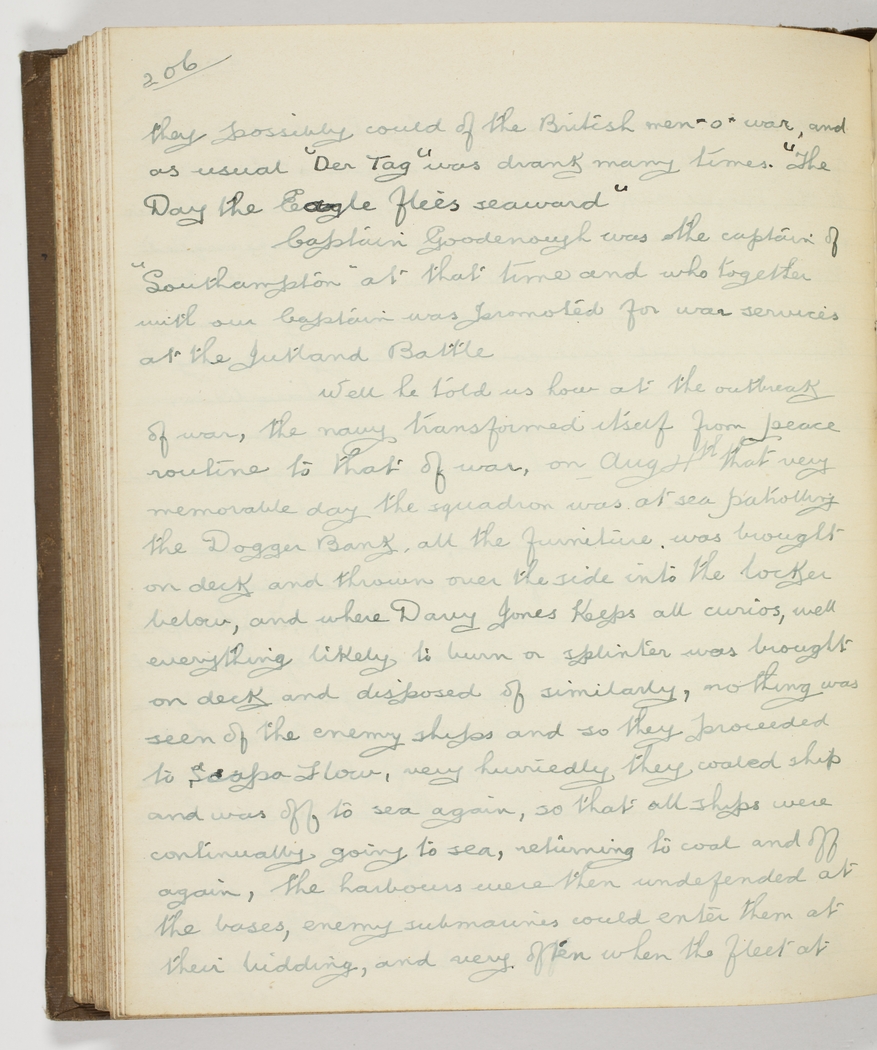 they possibly could of the British men-o-war, and as usual "Der Tag" was drank many times. "The Day the Eagles flies seaward" – Captain Goodenough was the captain of the "Southampton" at that time and who together with our Captain was promoted for war services at the Jutland Battle