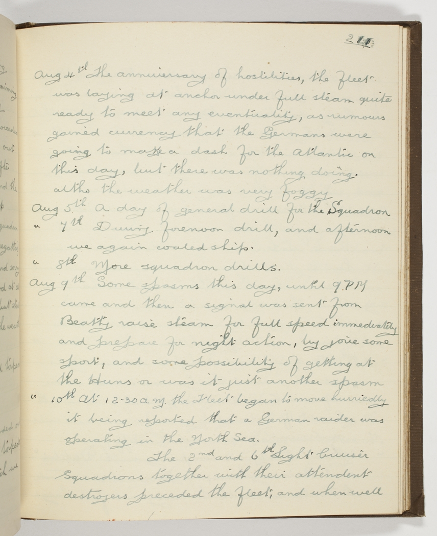 Aug 9th Some spasms this day, until 9 PM came and then a signal was sent from Beatty raise steam for full speed immediately and prepare for night action, - by jove some sport, and some possibility of getting at the Huns or was it just another spasm