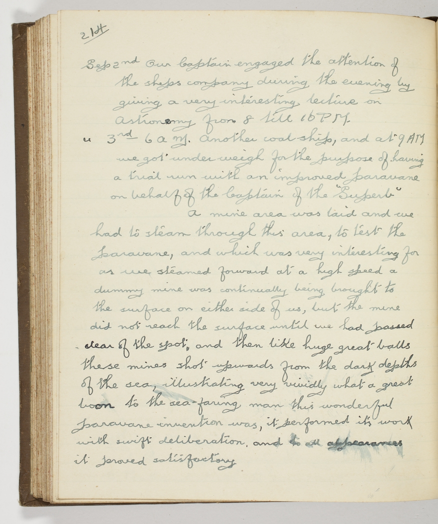 Sep, 3rd 6 am. Another coal ship, and at 9 AM we got under weigh for the purpose of having a trial run with an improved paravane on behalf of the Captain of the "Superb"