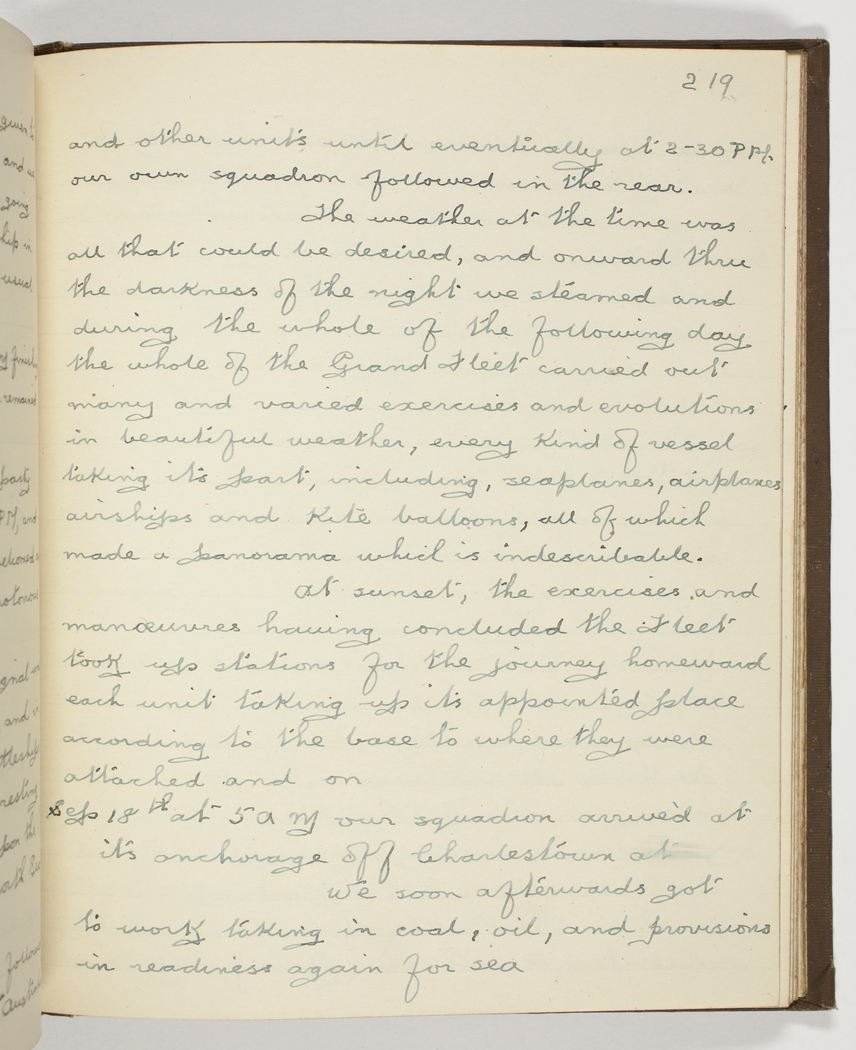 and other units eventually at 2.30 PM. our own squadron followed in the rear. The weather at the time was all that could be desired, and onward thru the darkness of the night we steamed and during the whole of the following day the whole of the Grand Fleet carried out many and varied exercises and evolutions in beautiful weather, every kind of vessel taking its part, including, seaplanes, airplanes airships and kite balloons, all of which made a panorama which is indescribable.