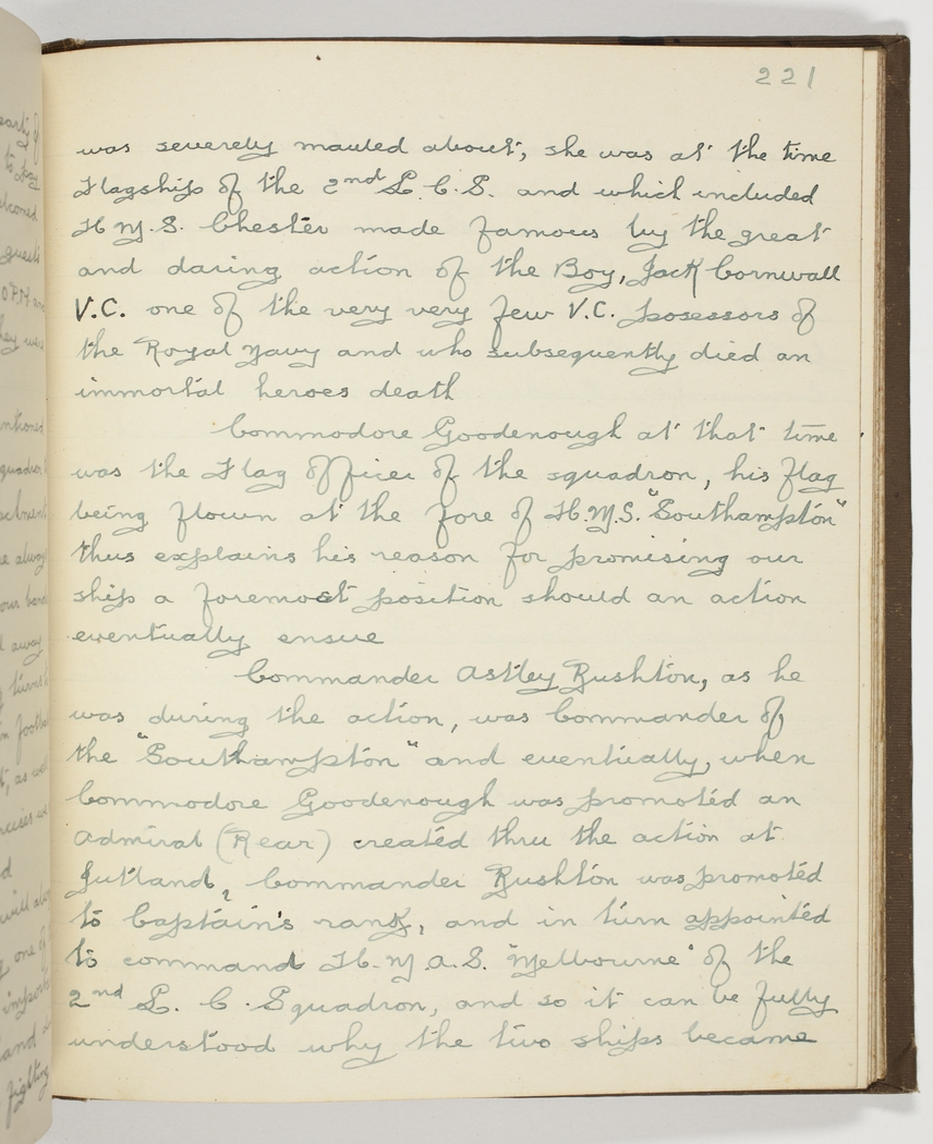 was severely mauled about, - she was at the time Flagship of the 2nd L.C.S. and which included H.M.S. Chester made famous by the great and daring action of the Boy, Jack Cornwall V.C. one of the very few V.C. possessors of the Royal Navy and who subsequently died an immortal heroes death – Commodore Goodenough at that time was the Flag Officer of the squadron, his flag being flown at the fore of H.M.S. "Southampton" thus explains his reason for promising our ship a foremost position should an action eventually ensue