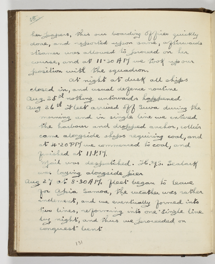 Aug 26th Fleet arrived off Suva during the morning and in single line we entered the harbour and dropped anchor, - collier came alongside ships requiring coal, and finished at 11 P.M.
