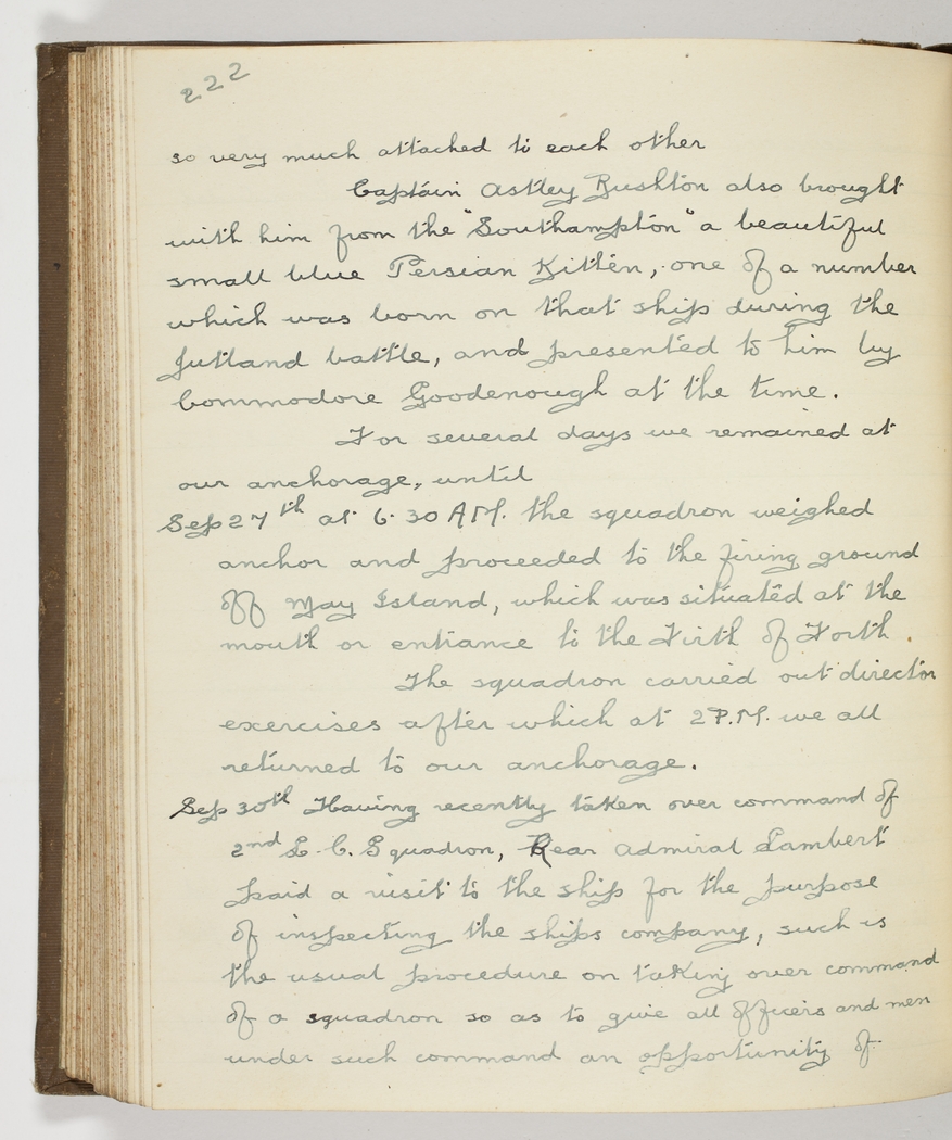 so very much attached to each other – Captain Astley Rushton also brought with him from the "Southampton" a beautiful small blue Persian kitten, one of a number which was born on that ship during the Jutland battle, and presented to him by Commodore Goodenough at the time. For several days we remained at our anchorage, until