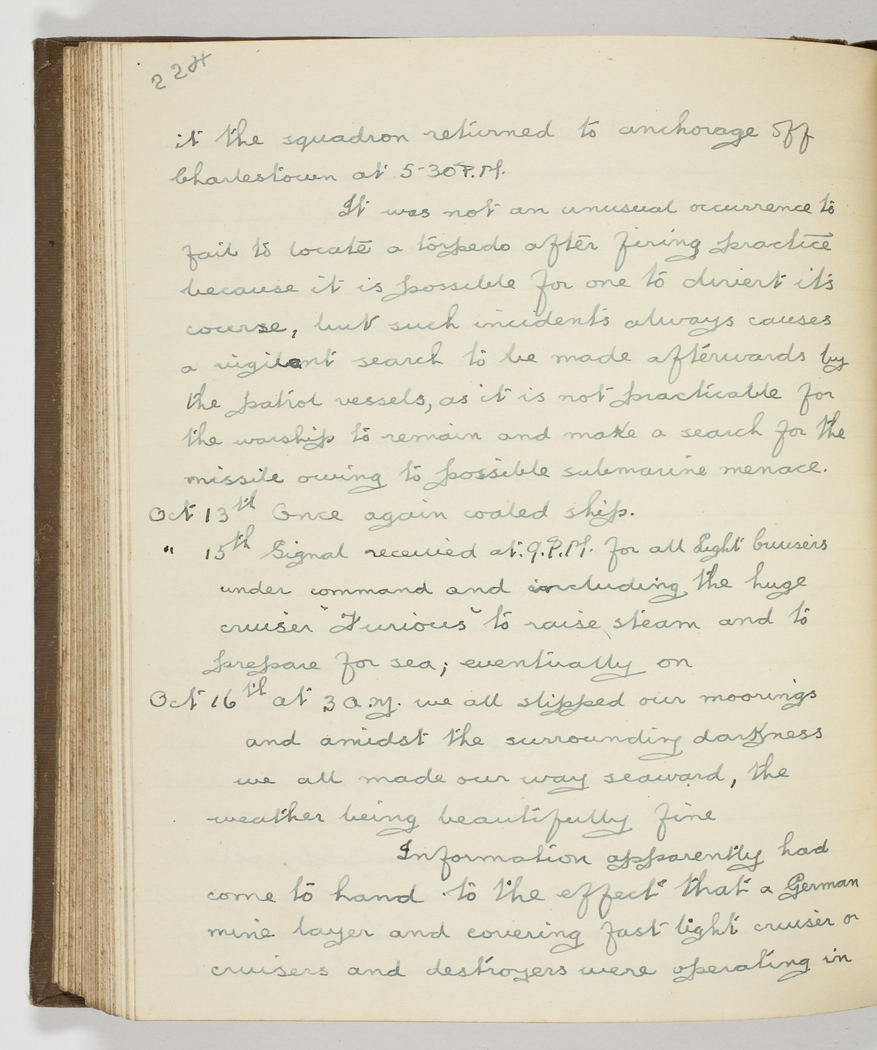 Oct 15th Signal received at 9 P.M. for all Light cruisers under command and including the huge cruiser "Furious" to raise steam and to prepare for sea; eventually on