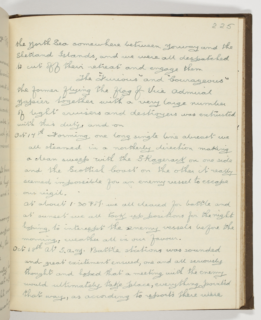 the North Sea somewhere between Norway and the Shetland Islands, and we were all despatched to cut off their retreat and engage them – The "Furious" and "Courageous" the former flying the flag of Vice Admiral Napier together with a very large number of light cruisers and destroyers was entrusted with this duty, and on
