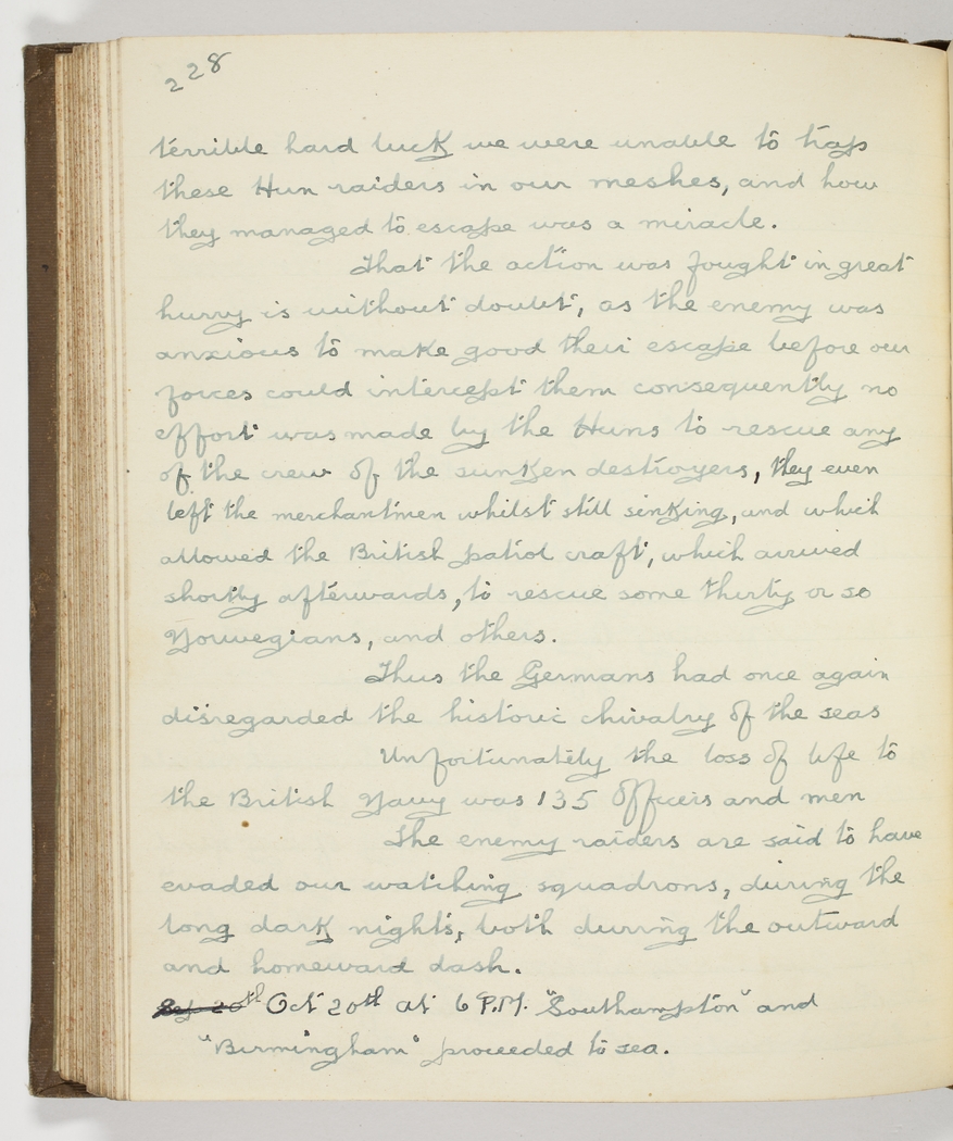 Thus the Germans had once again disregarded the historic chivalry of the seas – Unfortunately the loss of life to the British Navy was 135 officers and men – The enemy raiders are said to have evaded our watching squadrons, during the long dark nights, both during the outward and homeward dash.