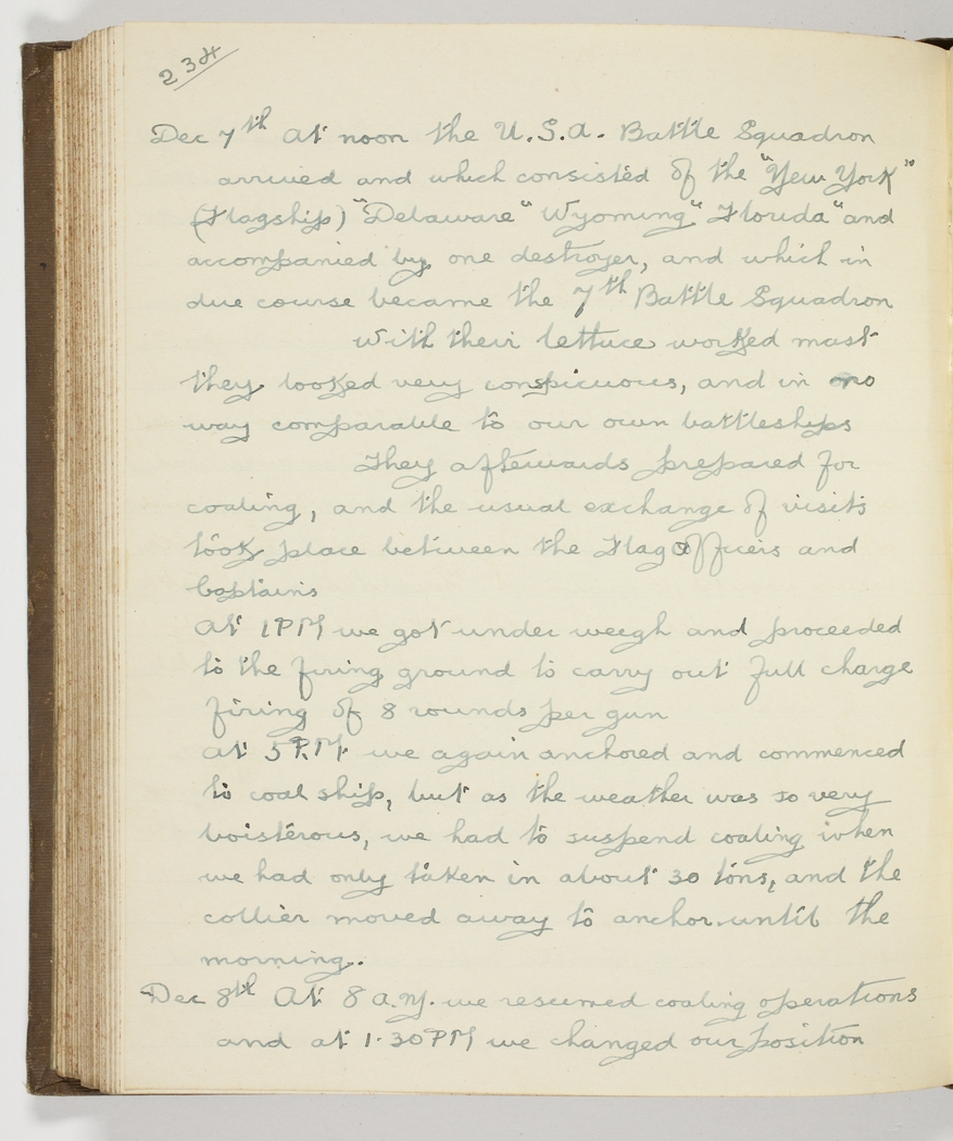 Dec 7th At noon the U.S.A. Battle Squadron arrived and which consisted of the "New York" (Flagship) "Delaware" Wyoming "Florida" and accompanied by one destroyer, and which in due course became the 7th Battle Squadron – With their lettuce [lattice] worked mast they looked very conspicuous, and in no way comparable to our own battleships – They afterwards prepared for coaling, and the usual exchange of visits took place between the Flag officers and Captains