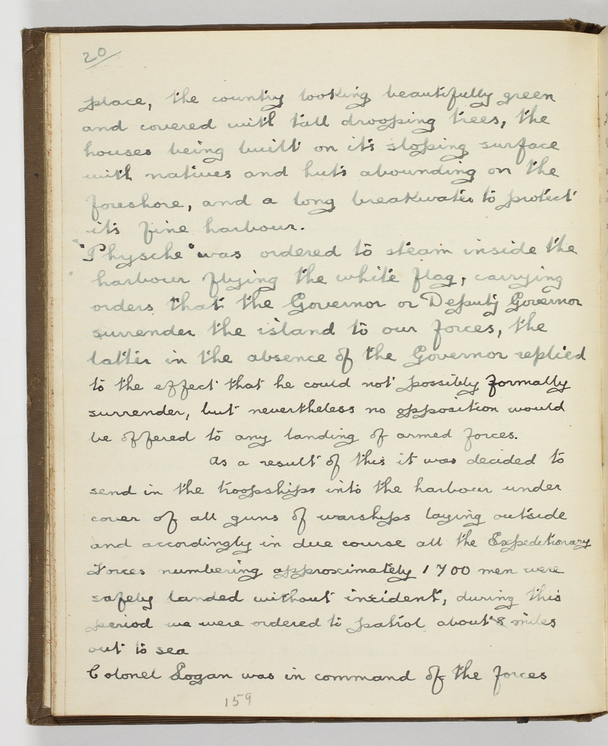 "Physche" was ordered to steam inside the harbour flying the white flag, [ensign] carrying orders that the Governor or Deputy Governor surrender the island to our forces, - the latter in the absence of the Governor replied to the effect that he could not possibly formally surrender, but nevertheless no opposition would be offered to any landing of armed forces.