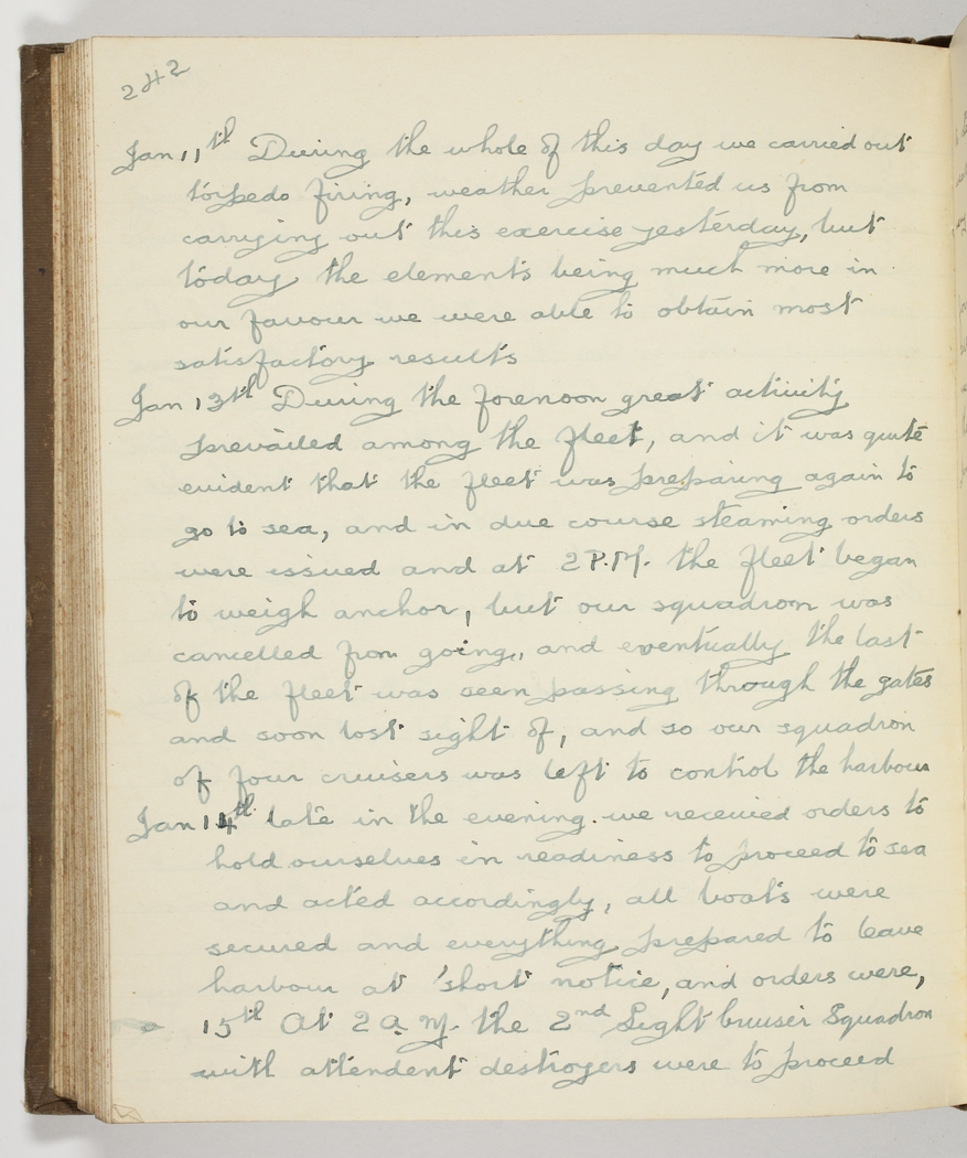 Jan 13th During the forenoon great activity prevailed among the fleet, and it was quite evident that the fleet was preparing again to go to sea, and in due course steaming orders were issued and at 2 P.M. the fleet began to weigh anchor, but our squadron was cancelled from going, - and eventually the last of the fleet was seen passing through the gates and soon lost sight of, and so our squadron of four cruisers was left to control the harbour