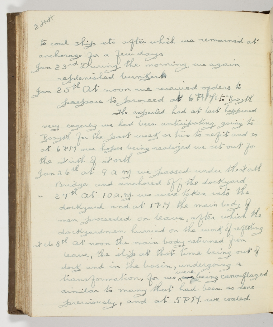 Jan 25th At noon we received orders to prepare to proceed at 6 PM to Rosyth – The expected had at last happened - very eagerly we had been anticipating going to Rosyrth for the last week or two to refit and so at 6 PM our hopes being realized we set out for the Firth of Forth