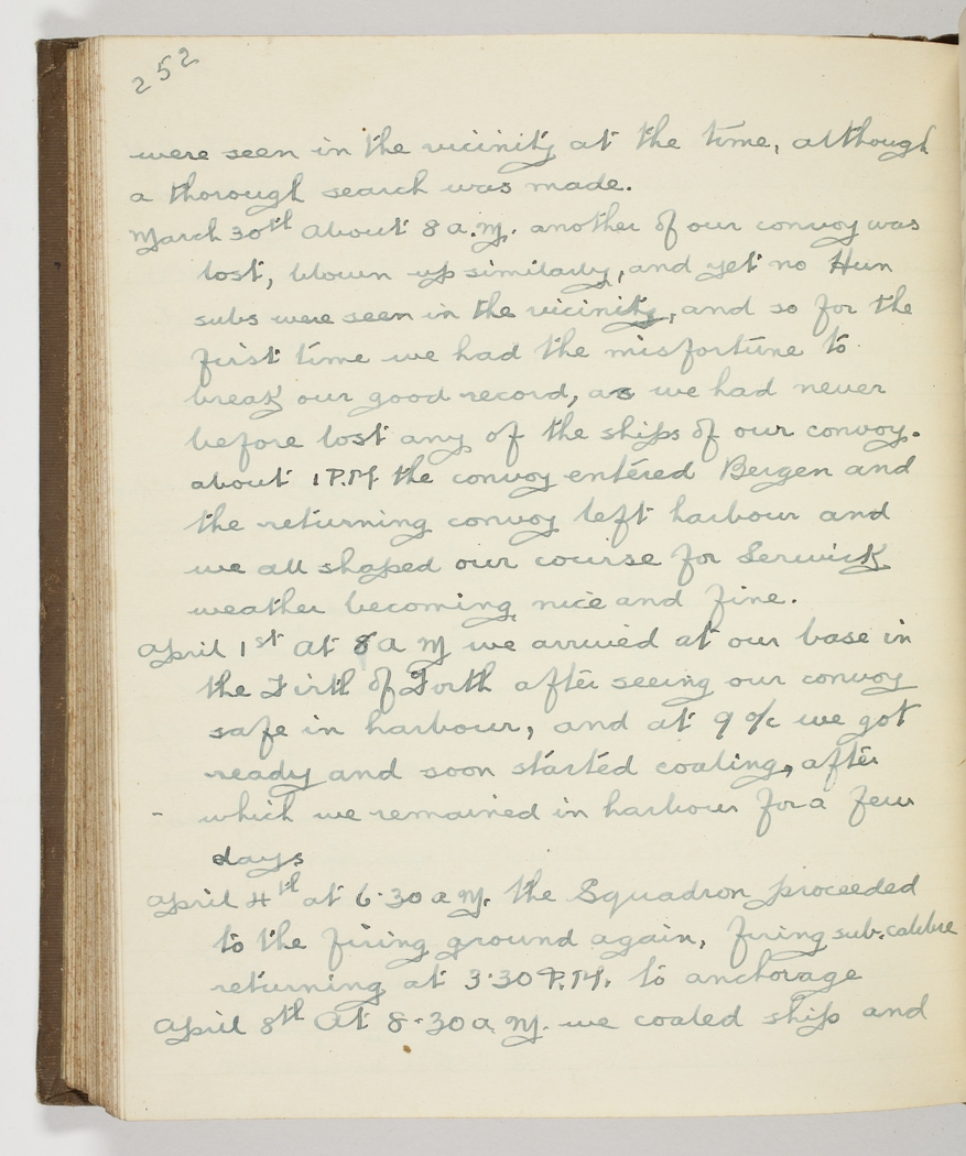 April 1st [1918] At 8 am we arrived at our base in the Firth of Forth after seeing our convoy safe in harbour, and at 9 o/c we got ready and soon started coaling, after which we remained in harbour for a few days