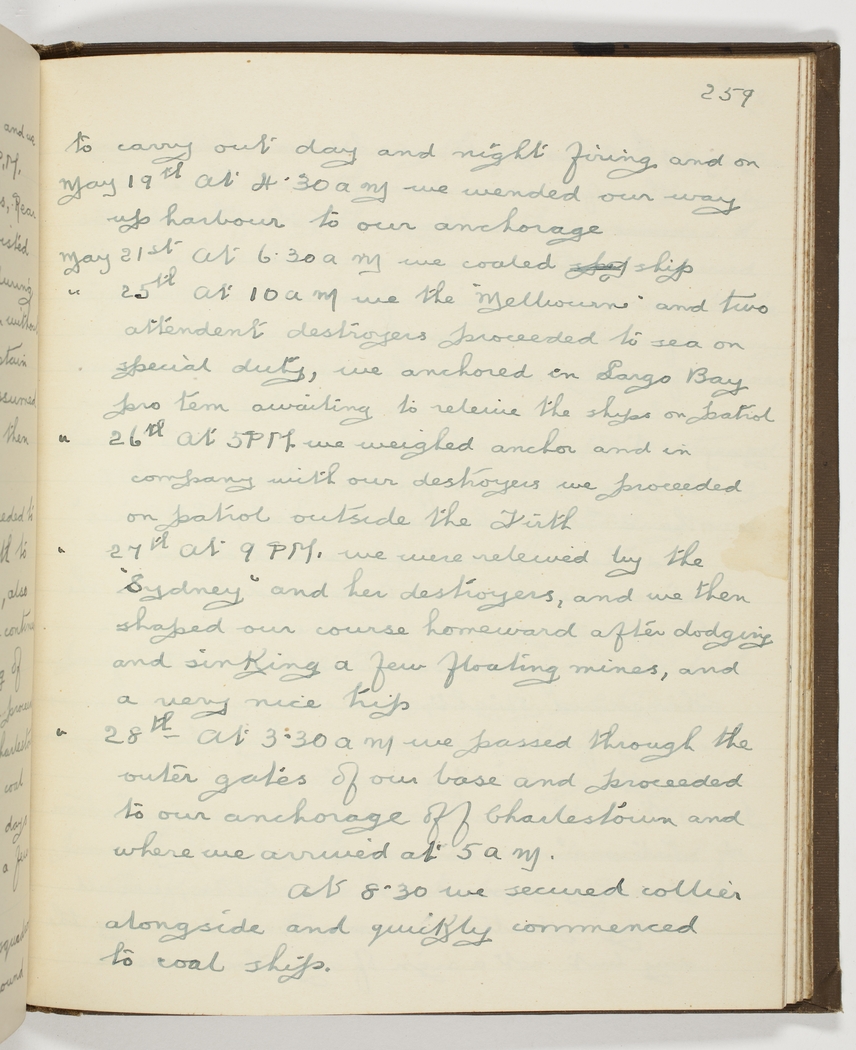 May 27th At 9 PM. we were relieved by the "Sydney" and her destroyers, and we then shaped our course homeward after dodging and sinking a few floating mines, and a very nice trip