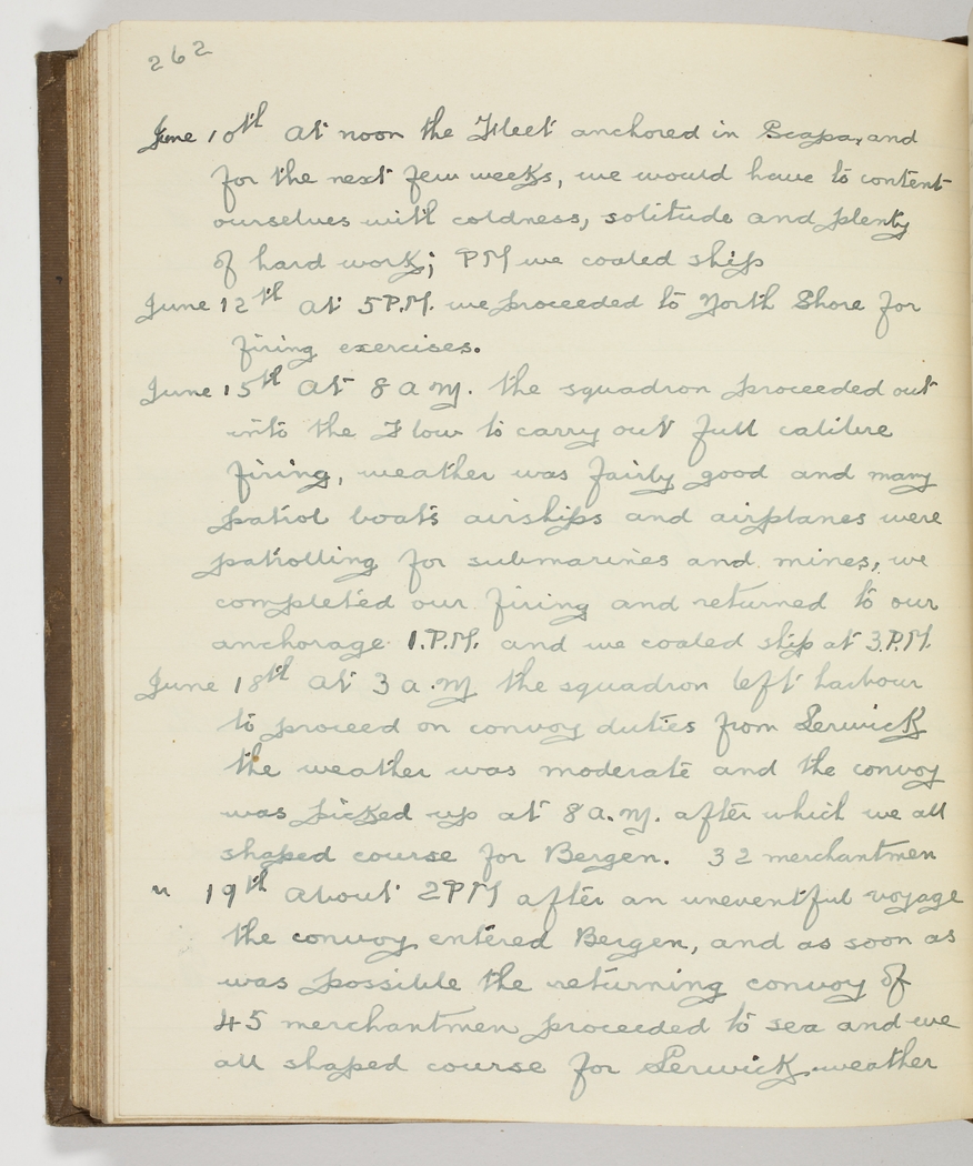 June 18th At 3 am. the squadron left harbour to proceed on convoy duties from Lerwick – the weather was moderate and the convoy was picked up at 8 a.m, after which we all shaped course for Bergen. 32 merchantmen
