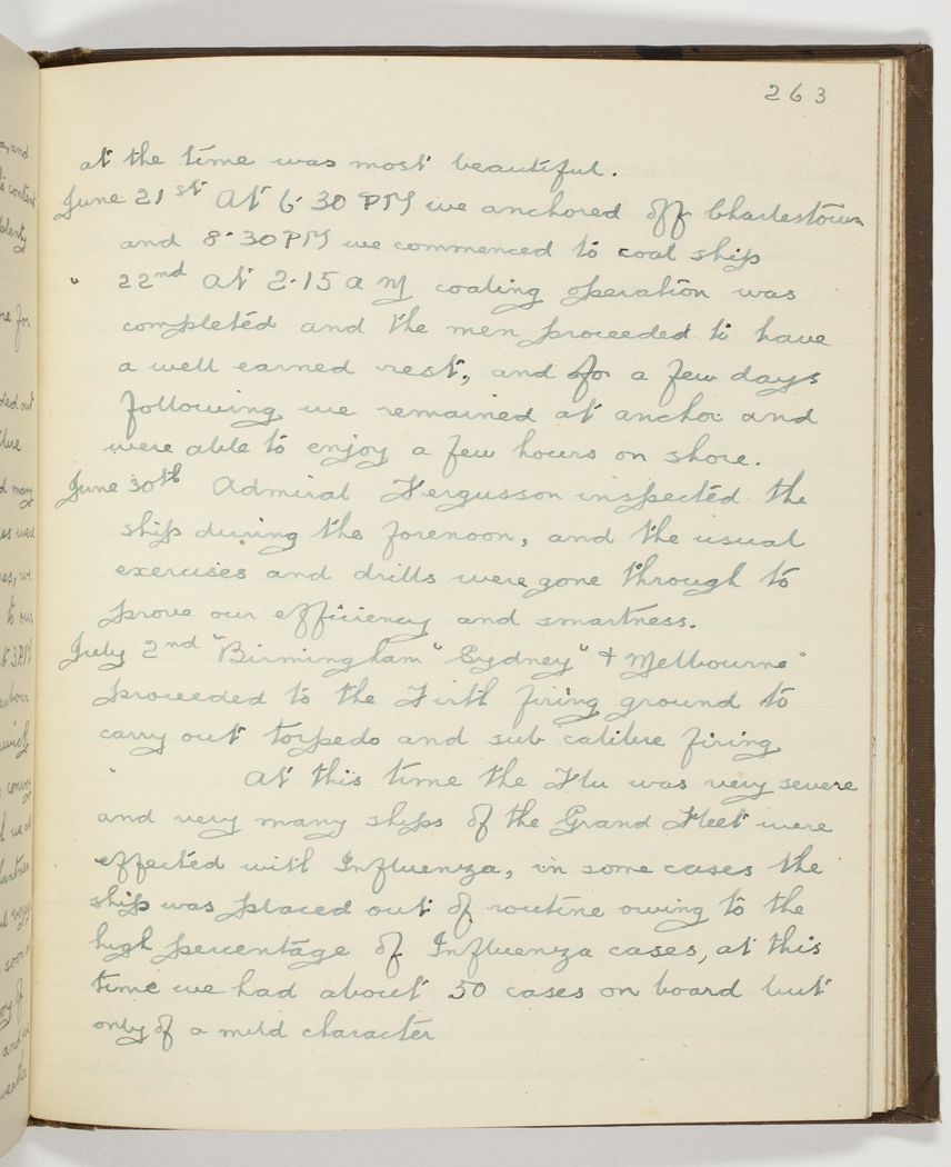 July 2nd "Birmingham" "Sydney" & "Melbourne" proceeded to the Firth firing ground to carry out torpedo and sub calibre firing – At this time the Flu was very severe and very many ships of the Grand Fleet were effected with Influenza, - in some cases the ship was placed out of routine owing to the high percentage of Influenza cases, - at this time we had about 50 cases on board but only of a mild character