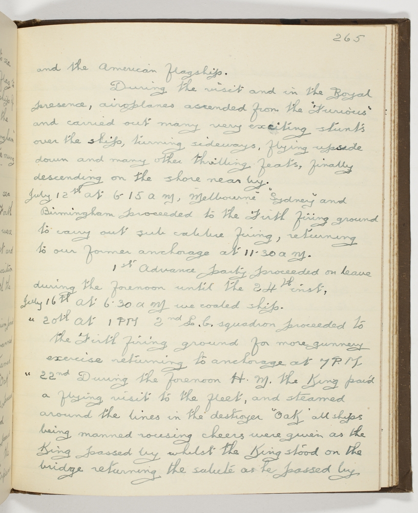 July 22nd During the forenoon H.M. the King paid a flying visit to the fleet, and steamed around the lines in the destroyer "Oak" – all ships being manned rousing cheers were give as the King passed by whilst the King stood on the bridge returning the salute as he passed by