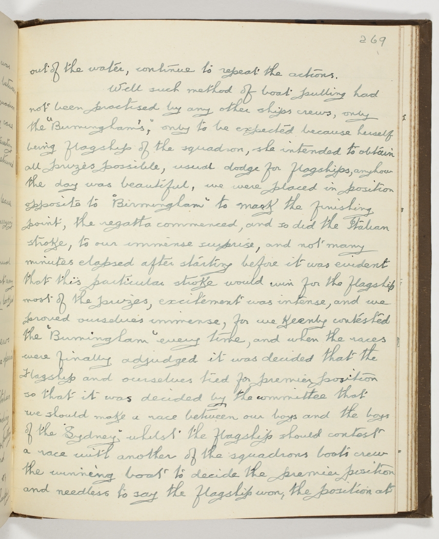 Well such method of boat pulling had not been practiced by any other ships crews, only the "Birmingham's", - only to be expected because being flagship of the squadron, she intended to obtain all prizes possible, usual dodge for flagships, any how the day was beautiful, we were placed in position opposite to "Birmingham" to mark the finishing point, - the regatta commenced, and so did the Italian stroke, to our immense surprise, and not many minutes elapsed after staring before it was evident this this particular stroke would win for the flagship most of the prizes, excitement was intense, and we proved ourselves immense, for we keenly contested the "Birmingham" every time, and when the races were finally adjudged it was decided that the Flagship and occasionally ourselves tied for premier position so that it was decided by the committee that we should make a race between our boys and the boys of the "Sydney" whilst the flagship should contest a race with another of the squadrons boats crew the winning boat to decide the premier position and needless to say the flagship won, the position at