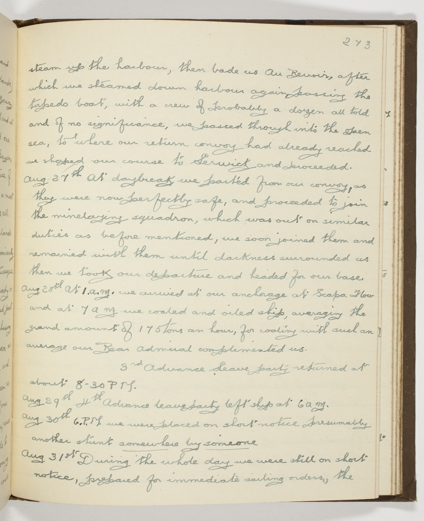 Aug 28th [1918] At 1 a.m. we arrived at our anchorage at Scapa Flow and at 7 am we coaled and oiled ship, averaging the grand amount of 175 tons an hour, for coaling with such an average our Rear Admiral complimented us. 3rd Advance Leave party returned at about 8.30 PM.