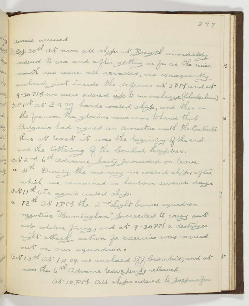 Oct 1st at 2 am hands coaled ship, and then in the forenoon the glorious news came to hand that Bulgaria had signed an armistice with the Entente thus it was at least the beginning of the end and the tottering of the Central Empires.