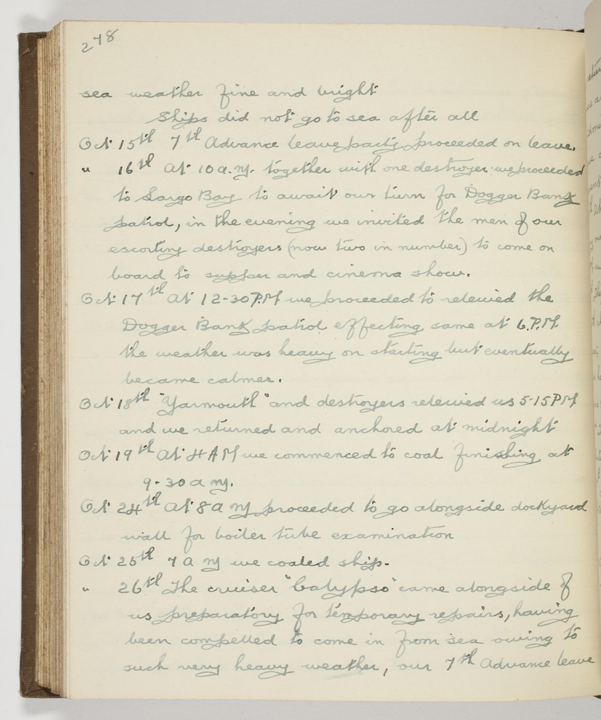 Oct 26th The cruiser "Calypso" came alongside of us preparatory for temporary repairs, having been compelled to come in from sea owing to such very heavy weather,- our 7th Advance leave