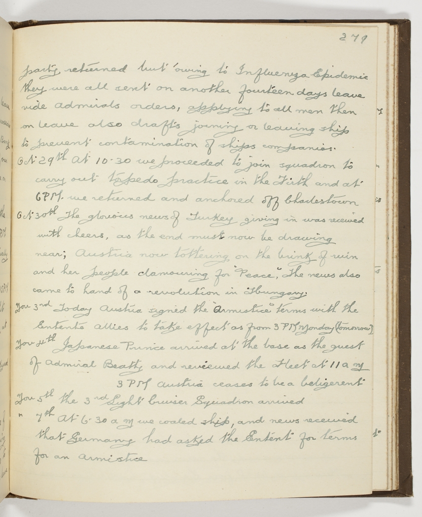 Nov 4th Japanese Prince arrived at the base as the guest of Admiral Beatty and reviewed the Fleet at 11 am – 3 PM Austria ceases to be a belligerent