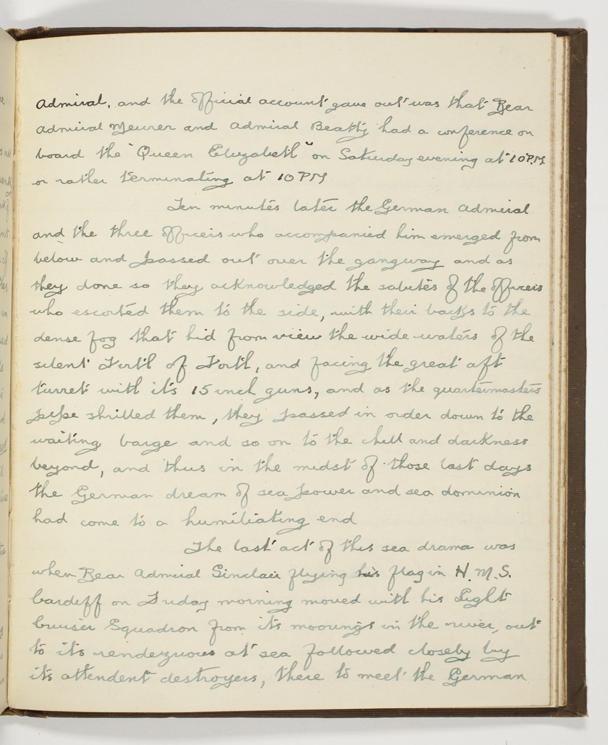Admiral, - and the official account gave out was that Rear Admiral Meurer and Admiral Beatty had a conference on board the "Queen Elizabeth" on Saturday [Nov 16th] evening at 10 P.M. or rather terminating at 10 PM – Ten minutes later the German Admiral and the three officers who accompanied him emerged from below and passed out over the gangway and as they done so they acknowledged the salutes of the officers who escorted them to the side, - with their backs to the dense fog that hid from view the wide waters of the silent Firth of Forth, and facing the great aft turret with its 15 inch guns, and as the quartermasters pipe shrilled them, they passed in order down to the waiting barge and so on to the chill and darkness beyond, - and thus in the midst of those last days the German dream of sea power and sea domination had come to a humiliating end –