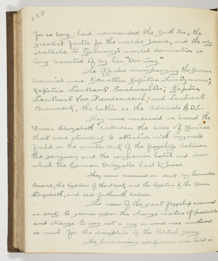 The officers accompanying the German Admiral were Korvetten Kapitan Hintzmann; Kapitan Leutnent Saalwachter; Kapitan Leutnent Von Frendenreuch; and Leutnent Brauneck, the latter as the Admirals A.D.C. They were received on board the "Queen Elizabeth" between the lines of Marines that were standing to attention with bayonets fixed on the quarter deck of the flagship between the gangway and the companion hatch and down which the German Delegates had to pass.