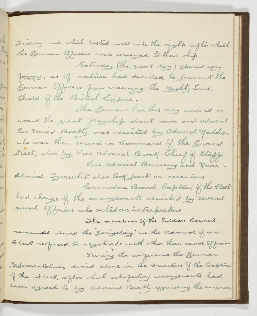 Friday and which lasted well into the night after which the German officers were conveyed to their ship – Saturday [16th ] (the great day) opened very foggy, as if nature had decided to prevent the German officers from viewing the Mighty Sure Shield of the British Empire. The Germans on this day arrived on board the great flagship about noon and Admiral Sir David Beatty was assisted by Admiral Maddon who was then second in Command of the Grand Fleet, also by Vice Admiral Brock Chief of Staff – Vice Admiral Browning and Rear Admiral Tyrrwhit also took part on occasions – Commodore Brand Captain of the Fleet had charge of the arrangements assisted by several naval officers who acted as interpreters – The members of the Soldiers Council remained on board the "Konigsberg" as the Admiral of our Fleet refused to negotiate with other than naval officers – During the conference the German Representatives dined alone in the Quarters of the Captain of the Fleet, after which satisfactory arrangements had been agreed to by Admiral Beatty regarding the surrender