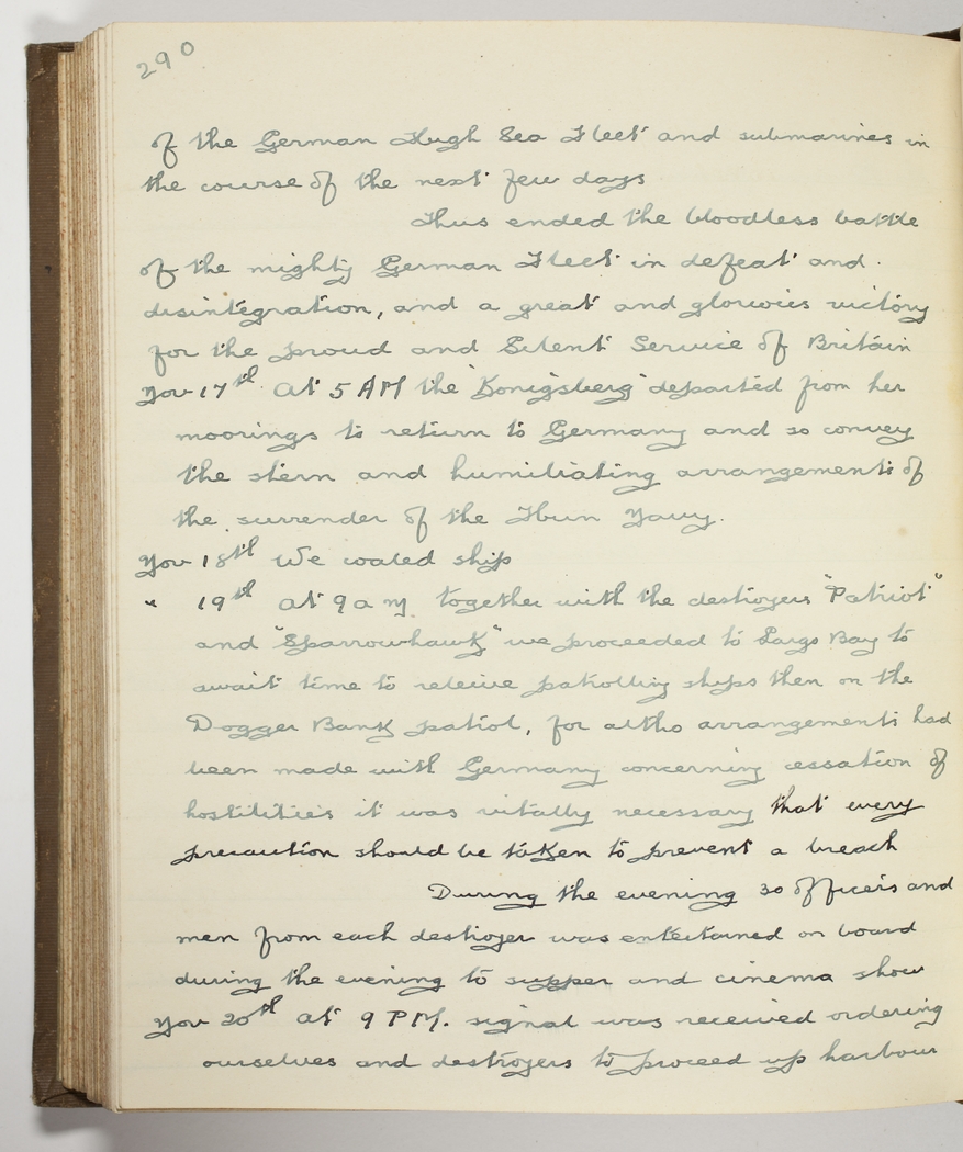 Nov 19th At 9 am together with the destroyers "Patriot" and "Sparrowhawk" we proceeded to Largo Bay to await time to relieve patrolling ships then on the Dogger Bank patrol, for altho arrangements had been made with Germany concerning cessation of hostilities it was vitally necessary that every precaution should be taken to prevent a breach – During the evening 30 officers and men from each destroyer was entertained on board during the evening to supper and cinema show
