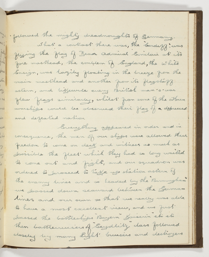 Everything appeared in order and in consequence, the men of our ships were allowed their freedom to come on deck and witness as much as possible the fleet which they had so long waited to come out and fight, - and our squadron was ordered to proceed to take up station astern of the enemy lines and so headed by the "Birmingham" we passed down seaward between the German lines and our own so that we really was able to have a most excellent view, -and we first passed the battleships "Bayern" "Kaiserin" etc etc then battlecruisers of "Seydlitz" class followed closely by many Light Cruisers and destroyers