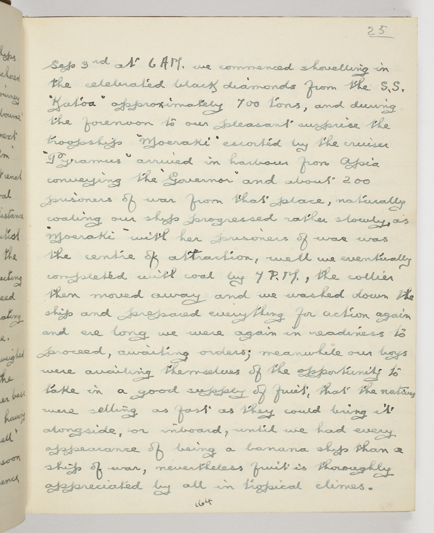 Sep 3rd at 6 AM we commenced shovelling in the celebrated black diamonds from the S.S. "Katoa" approximately 700 tons, and during the forenoon to our pleasant surprise the troopship "Moeraki" escorted by the cruiser "Pyramus" arrived in harbour from Apia conveying the "Governor" and about 200 prisoners of war from that place,- naturally coaling our ship progressed rather slowly, as "Moeraki" with her prisoners of war was the centre of attraction,- well we eventually completed with coal by 7 P.M., - the collier then moved away and we washed down the ship and prepared everything for action again and ere long we were again in readiness to proceed, awaiting orders; -meanwhile our boys were availing themselves of the opportunity to take in a good supply of fruit, that the natives were selling as fast as they could bring it alongside, or inboard, until we had every appearance of being a banana ship than a ship of war, nevertheless fruit is thoroughly appreciated by all in tropical climes