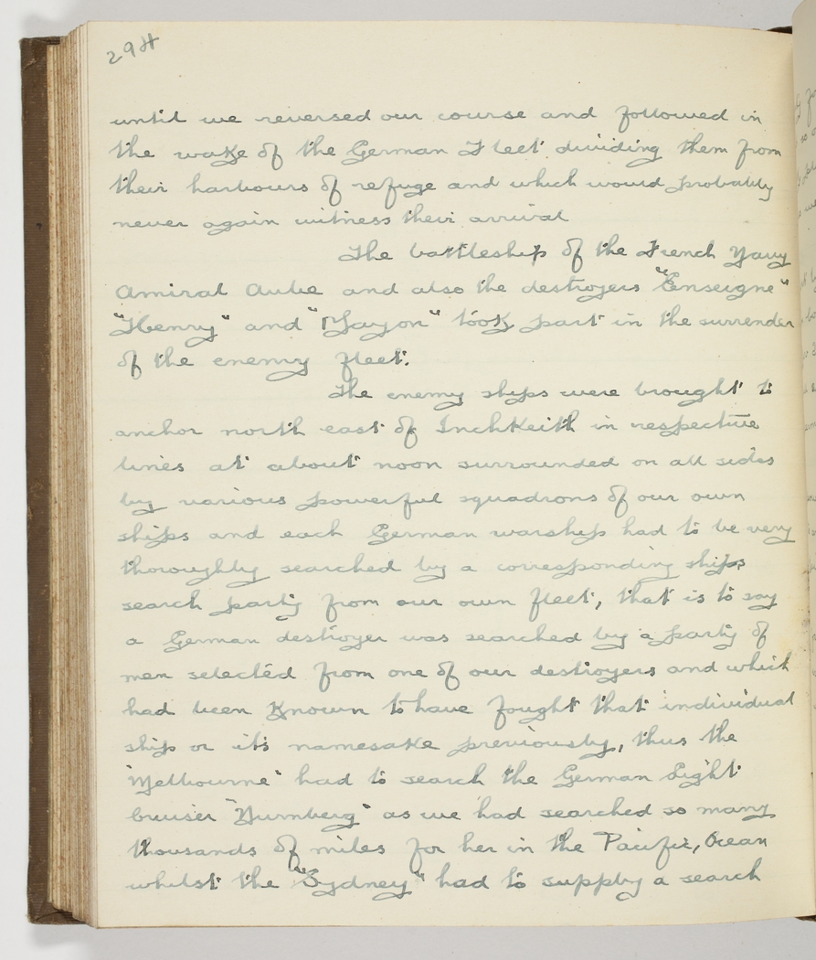 The enemy ships were brought to anchor north east of Inchkeith in respective lines about noon surrounded on all sides by various powerful squadrons of our own ships - and each German warship had to be very thoroughly searched by a corresponding ships search party of men selected from one of our destroyers and which had been known to have fought that individual ship or its namesake previously, - thus the "Melbourne" had to search the German Light Cruiser "Nurmberg" as we had searched so many thousands of miles for her in the Pacific Ocean whilst the "Sydney" had to supply a search