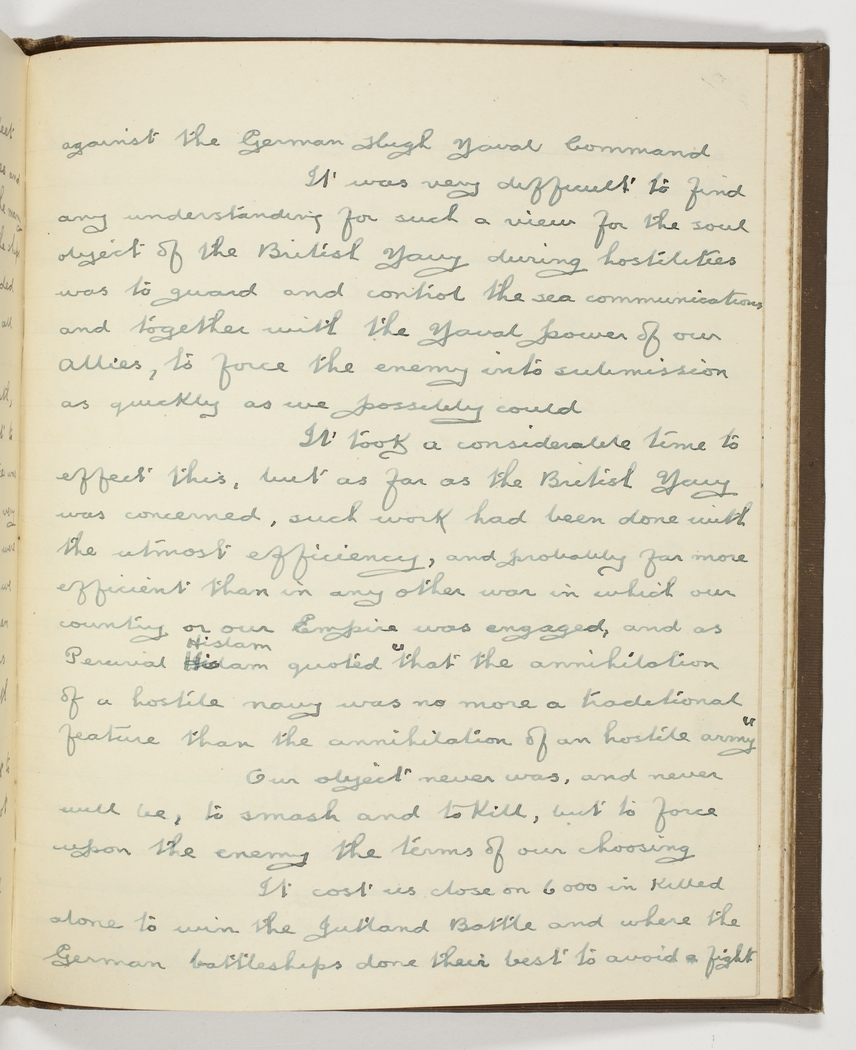 against the German High Command – It was very difficult to find an understanding for such a view for the soul object of the British Navy during hostilities was to guard and control the sea communications and together with the Naval power of our Allies, to force the enemy into submission as quickly as we possibly could