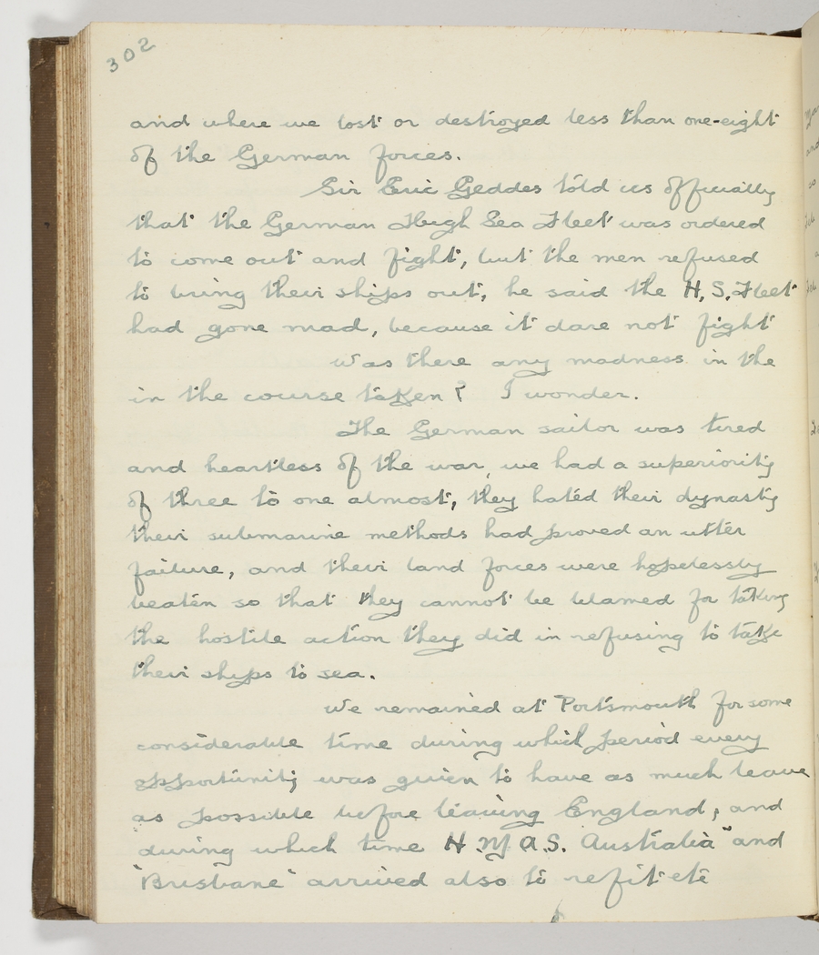 and where we lost or destroyed less than one-eight of the German forces. Sir Eric Geddes told us officially that the German High Seas Fleet was ordered to come out and fight, but the men refused to bring their ships out, - he said the H.S. Fleet had gone mad, because it dare not fight – Was there any madness in the in the course taken ? I wonder. The German sailor was tired and heartless of the war, we had a superiority of three to one almost, they hated their dynasty their submarine methods had proved an utter failure, and their land forces were hopelessly beaten so they cannot be blamed for taking the hostile action they did in refusing to take their ships out to sea.