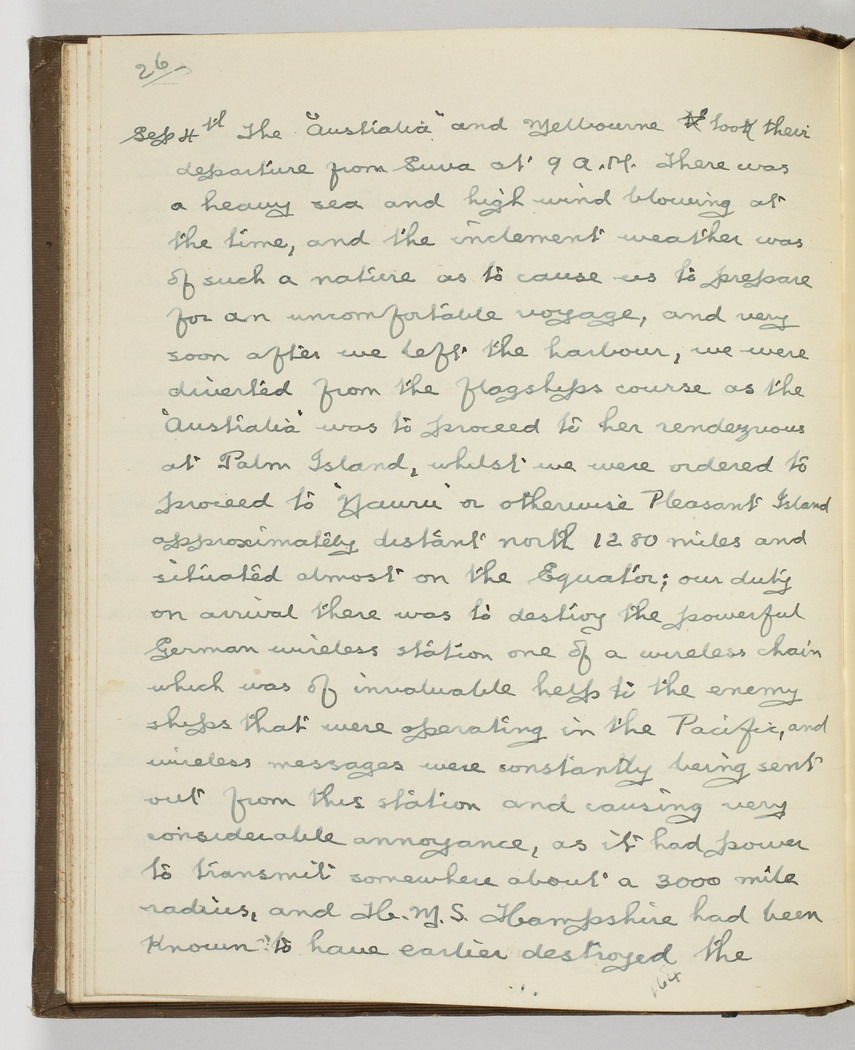 Sep 4th [1914] The "Australia" and "Melbourne" took their departure from Suva at 9 A.M. There was a heavy sea and high wind blowing at the time, and the inclement weather was of such a nature as to cause us to prepare for an uncomfortable voyage, - and very soon after we left the harbour, we were diverted from the flagships course as the "Australia was to proceed to her rendezvous at Palm Island, whilst we were ordered to proceed to "Nauru" or otherwise Pleasant Island approximately distant north 1280 miles and situated almost on the Equator; - our duty on arrival there was to destroy the powerful German wireless station one of a wireless chain which was invaluable help to the enemy ships that were operating in the Pacific, and wireless messages were constantly being sent out from this station and causing very considerable annoyance, as it had power to transmit somewhere about a 3000 mile radius, and H.M.S. Hampshire had been known to have earlier destroyed the