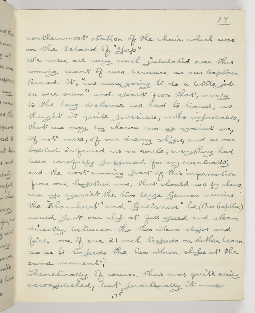 We were all very much jubilated over this coming event of ours because as our Captain termed it, "we were going to do a little job on our own" and apart from that, owing to the long distance we had to travel, - we thought it quite possible, altho improbable, that we may by chance run up against one, it not more, of our enemy ships, and as our Captain informed us en route, everything had been carefully prepared for any eventuality and the most amusing part of this information from our Captain was, that should we by chance run up against the two large German cruisers the "Sharnhorst" and "Gneisnau" he (our Captain) would put our ship at full speed and steam directly between the two ships Hun ships and fire one of our 21 inch torpedo on either beam so as to torpedo the two Hun ships at the same moment.