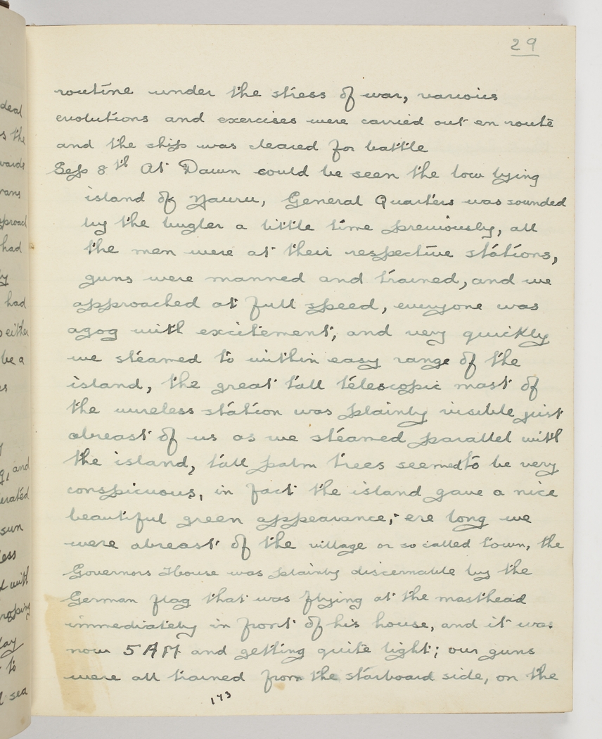 Sep 8th At dawn could be seen the low lying island of Nauru, - General Quarters was sounded by the bugler a little time previously, all the men were at their respective stations, guns were manned and trained, and we approached at full speed, - everyone was agog with excitement, and very quickly we steamed to within easy range of the island, the great tall telescopic mast of the wireless station was plainly visible just abreast of us as we steamed parallel with the island, tall palm trees seemed to be very conspicuous, in fact the island gave a nice beautiful green appearance; - ere long we were abreast of the village or so called town, the Governors House was plainly discernable by the German flag that was flying at the masthead immediately in front of his house; - our guns were all trained from the starboard side, on the