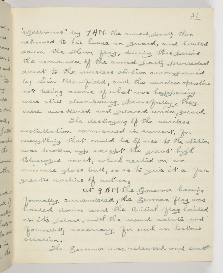 'Melbourne' by 7 A.M. - the armed party then returned to his house on guard, and hauled down the Hun flag, - during this period the remainder of the armed party proceeded direct to the wireless station accompanied by Lieu Blomfield, and the wireless operators not being aware of what was happening were still slumbering peacefully, - they were awakened and placed under guard.