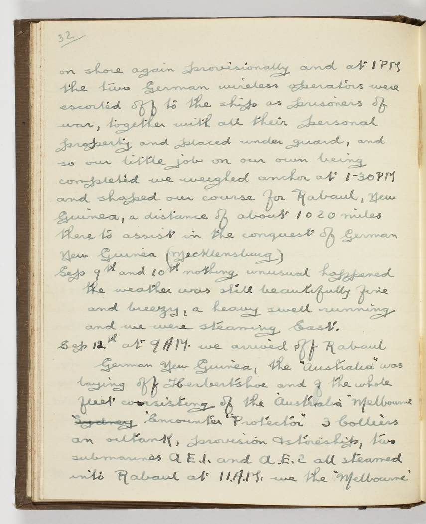 Sep 12th at 9 AM we arrive off Rabaul German New Guinea, - the "Australia" was laying off Herbertshoe and the whole fleet consisting of the "Australia" "Melbourne" "Encounter" "Protection" 3 Colliers an oiltank, provision & storeship, two submarines A.E.1. and A.E.2. all steamed into Rabaul at 11 A.M. – we the "Melbourne"