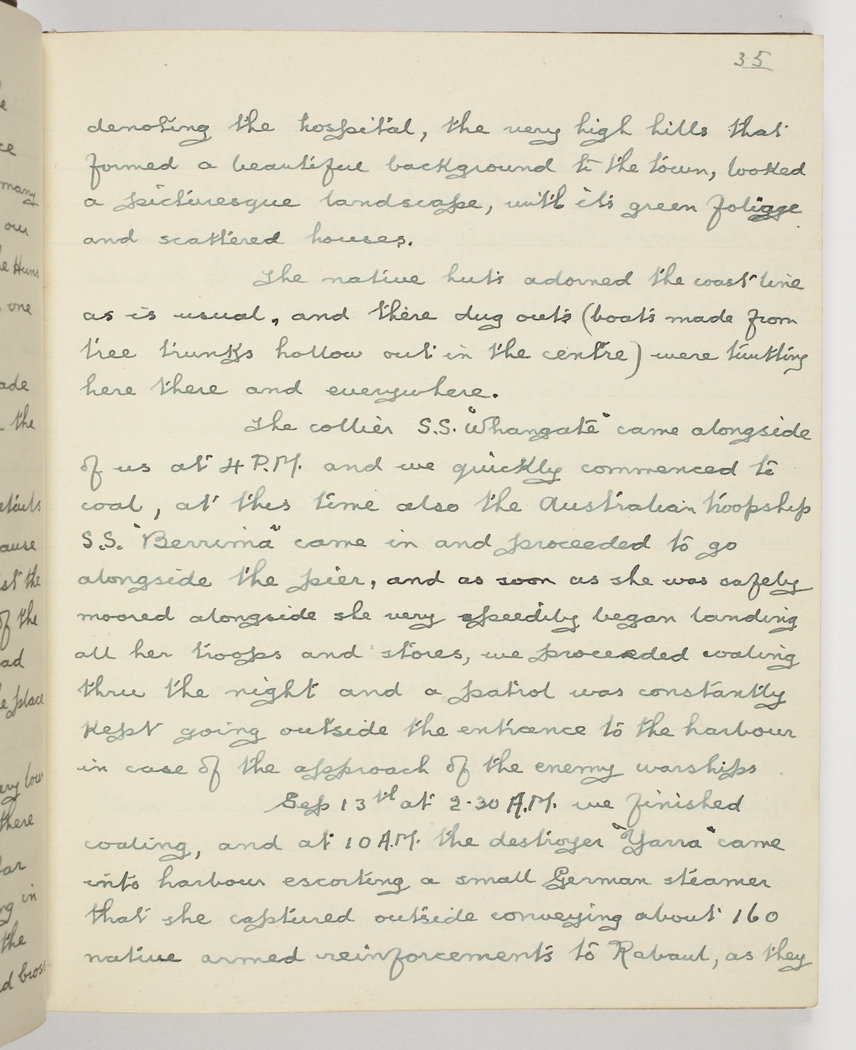 Sep 13th [1914] at 2.30 A.M. we finished coaling, and at 10 A.M. the destroyer "Yarra" came into harbour escorting a small German steamer that she captured outside conveying about 160 native armed reinforcements to Rabaul, as they