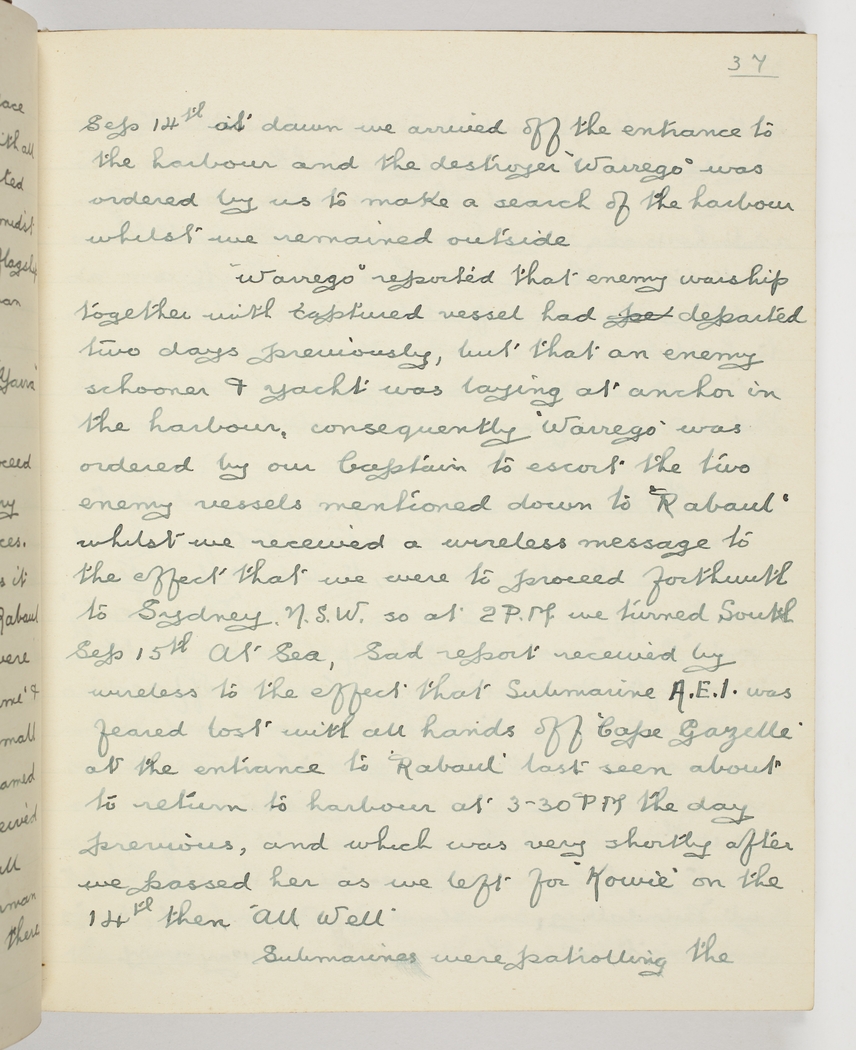 Sep 14th [1914] at dawn we arrived off the entrance to the harbour and the destroyer "Warrego" was ordered by us to make a search of the harbour whilst we remained outside