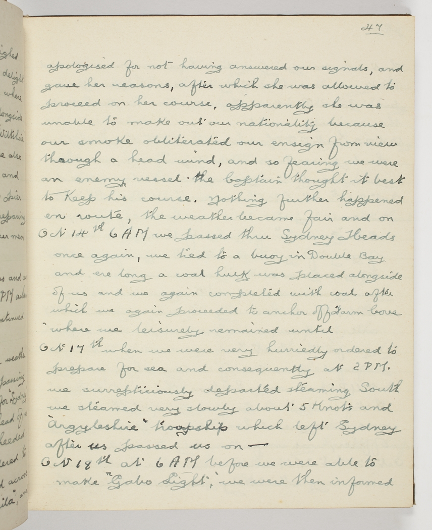 Oct 17th when we were very hurriedly ordered to prepare for sea and consequently at 2 PM we surrepticiously departed steaming South – we steamed very slowly about 5 knots and "Argyleshire" troopship which left Sydney after us passed us on –