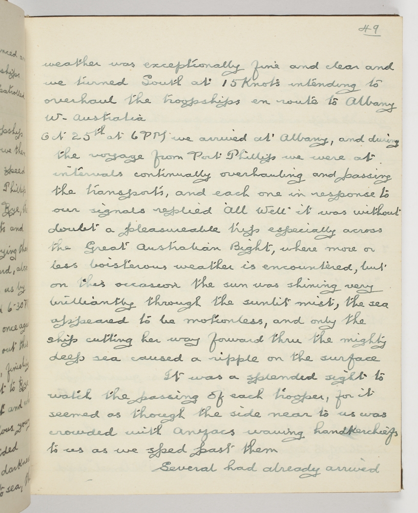 Oct 25th at 6 PM we arrived at Albany, and during the voyage from Port Phillip we were at intervals continually overhauling and passing the transports, and each one in response to our signals replied 'All Well' – it was without doubt a pleasurable trip especially across the Great Australian Bight, where more or less boisterous weather is encountered, - but on this occasion the sun was shining very brilliantly through the sunlit mist, the sea appeared to be motionless, and only the ship cutting her way forward thru the mighty deep sea caused a ripple on the surface